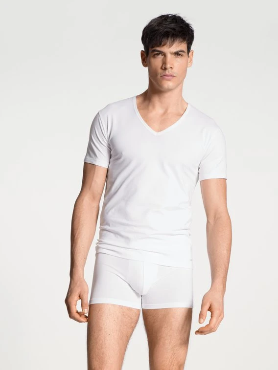 Die modernen T-Shirts mit V-Ausschnitt der COTTON CODE Kollektion von CALIDA verbinden zeitlose Form und höchste Qualität: Dank feinster Jersey Baumwolle überzeugen die T-Shirts nicht nur in der Qualität, sondern auch mit perfekter Passform und exzellenter Verarbeitung. Der klassisch-moderne Schnitt mit V-Neck ist an kühleren Tagen auch ein passendes Darunter unter Ihrem Business-Hemd.