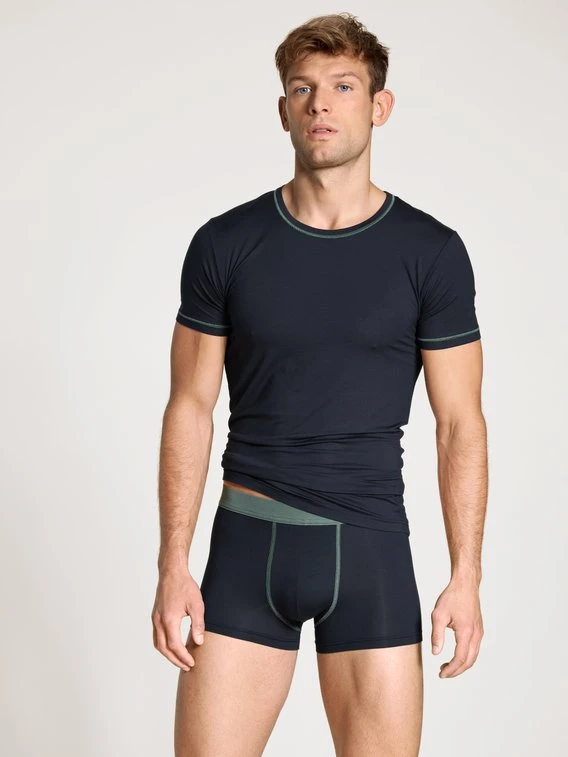 Die Form folgt der Funktion? Das SEAWEED MICRO T-Shirt mit Rundhals von CALIDA geht die Sache lieber andersherum an. Das schlichte Shirt im körpernahen Schnitt überzeugt zuallererst mit seinem maskulinen Basic-Look, bevor es mit den Fähigkeiten seiner innovativen Fasern aus Holz und natürlichen Meeresalgen begeistert. Die haben es in sich: Schweiß, Hitze, Geruch oder Unwohlsein? Haben hier auf jeden Fall Pause!