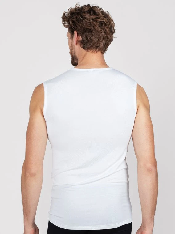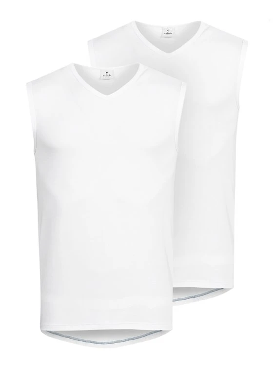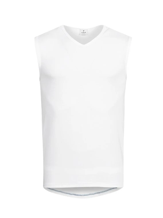 Business-Shirt ohne Arm aus der Serie “Manfred” von ERLICH TEXTIL. Die körpernahe Passform des Unterhemds sorgt dafür, dass es auch unter engen Hemden das perfekte “Darunter” ist. Das lange Rückenteil sorgt dafür, dass das weiche Material nicht aus der Anzughose herausrutscht, während alle Nähte besonders flach verarbeitet wurden. Der V-Ausschnitt bleibt unsichtbar, auch ohne Krawatte und mit geöffnetem Knopf.