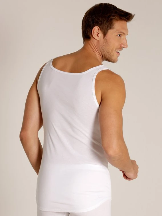 Klassisches Achselshirt mit körpergerechtem Funktionsschnitt und dauerelastischen Arm- und Beinabschlüssen. 100% feinste Pima-Baumwolle wurde zu einem Feinripp 1:1 in feinster Teilung verarbeitet.
